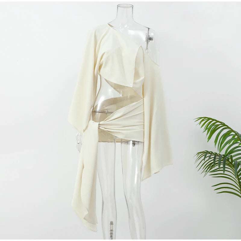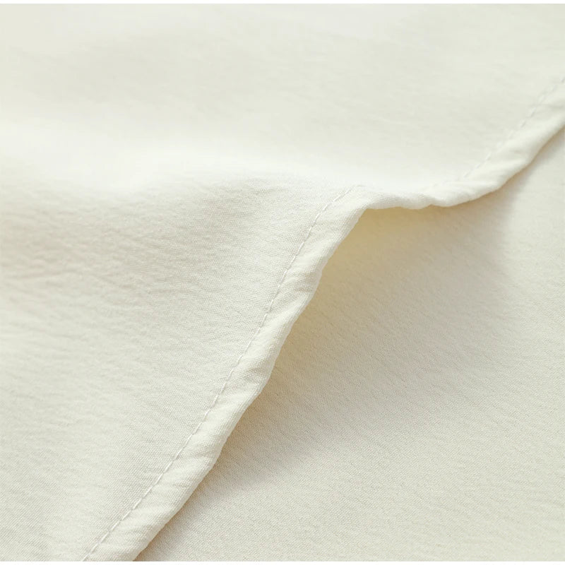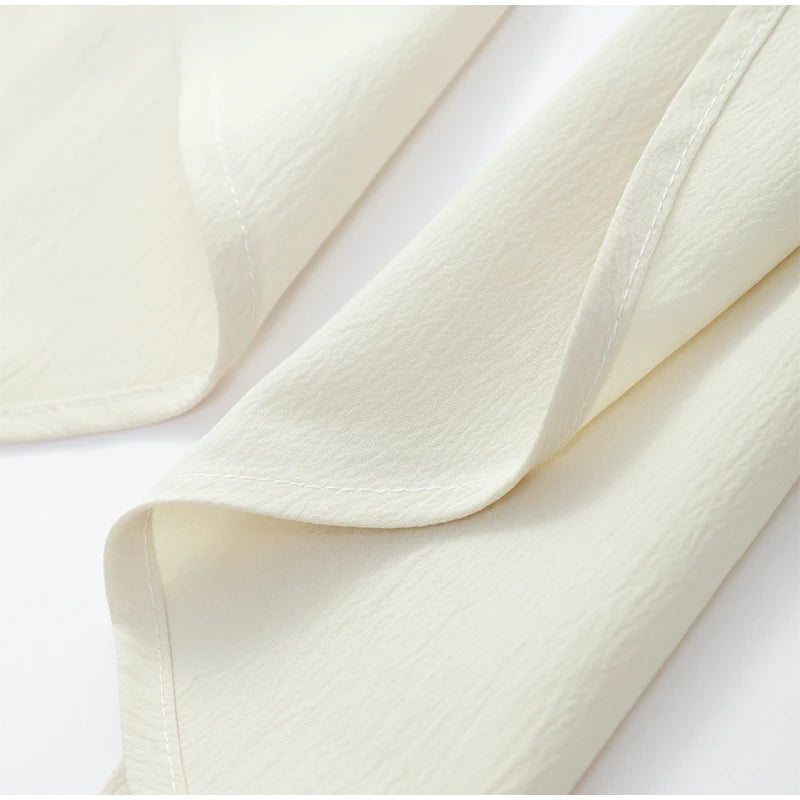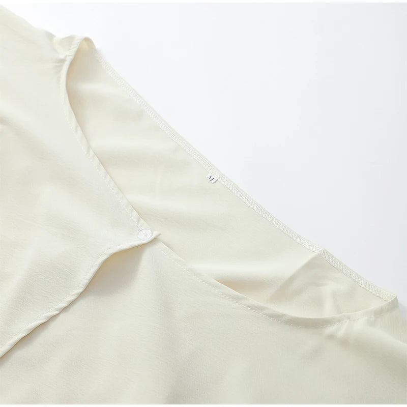 The blouse, tailored in lightweight chiffon, features a relaxed fit with bishop sleeves and a gentle V-neckline, creating a romantic silhouette.